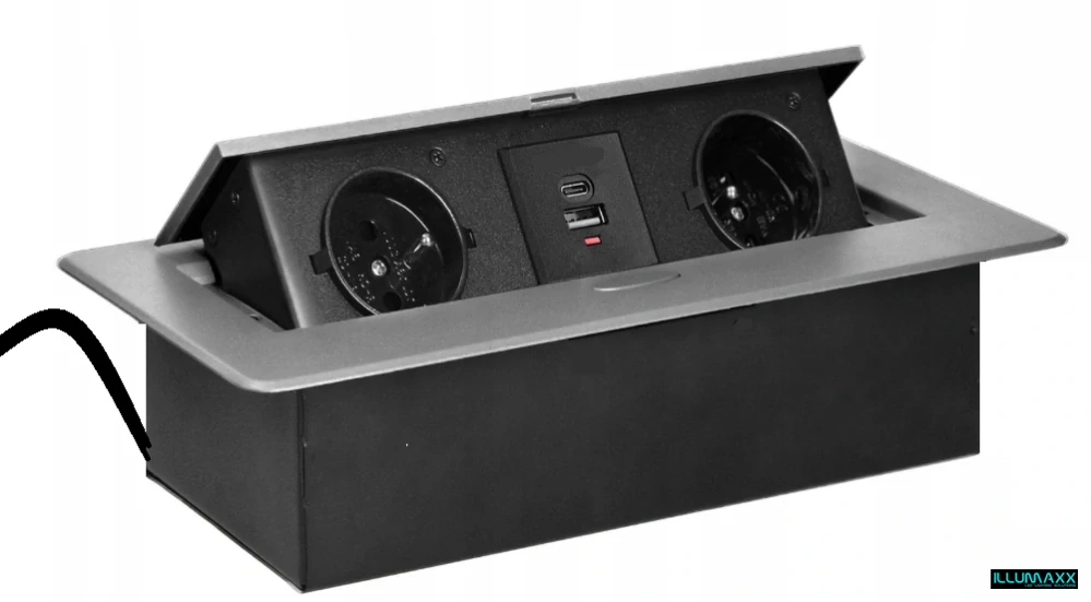 - Výklopná elektrická zásuvka 2x230V+1xUSB-A + 1x UBC-C, vestavná stříbrná, oblé hrany s kabelem 2,0m